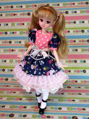 髪型は女の子らしさが盛り上がるツインテールなので、このリカちゃんには、まずはアイドル服やロリィタ服や魔女っ娘コスプレみたいな、甘ったるい夢可愛い服装をさせてみたいと思いました。