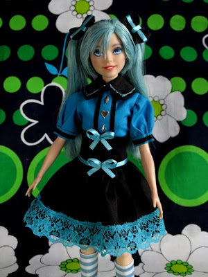 ミクの最も基本的な服装は既にドール服としても出尽くしているし、再現出来る材料も持っていません。それで単に黒と水色のミク色で、二次元好きが好みそうっぽい恰好をさせてみました。こんな服は、ミクのフィギュアにもイラストにも存在しません。
